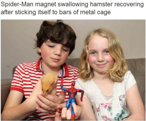 Covered by a wide range of news outlets (did nothing else happen this week??), the story centers around a hamster named Smurf and a Spiderman toy with a magnet. Smurf ate the magnet, climbed about in his cage and then the magnet, doing what magnets do, stuck him to the bars like a pizza menu to a fridge.