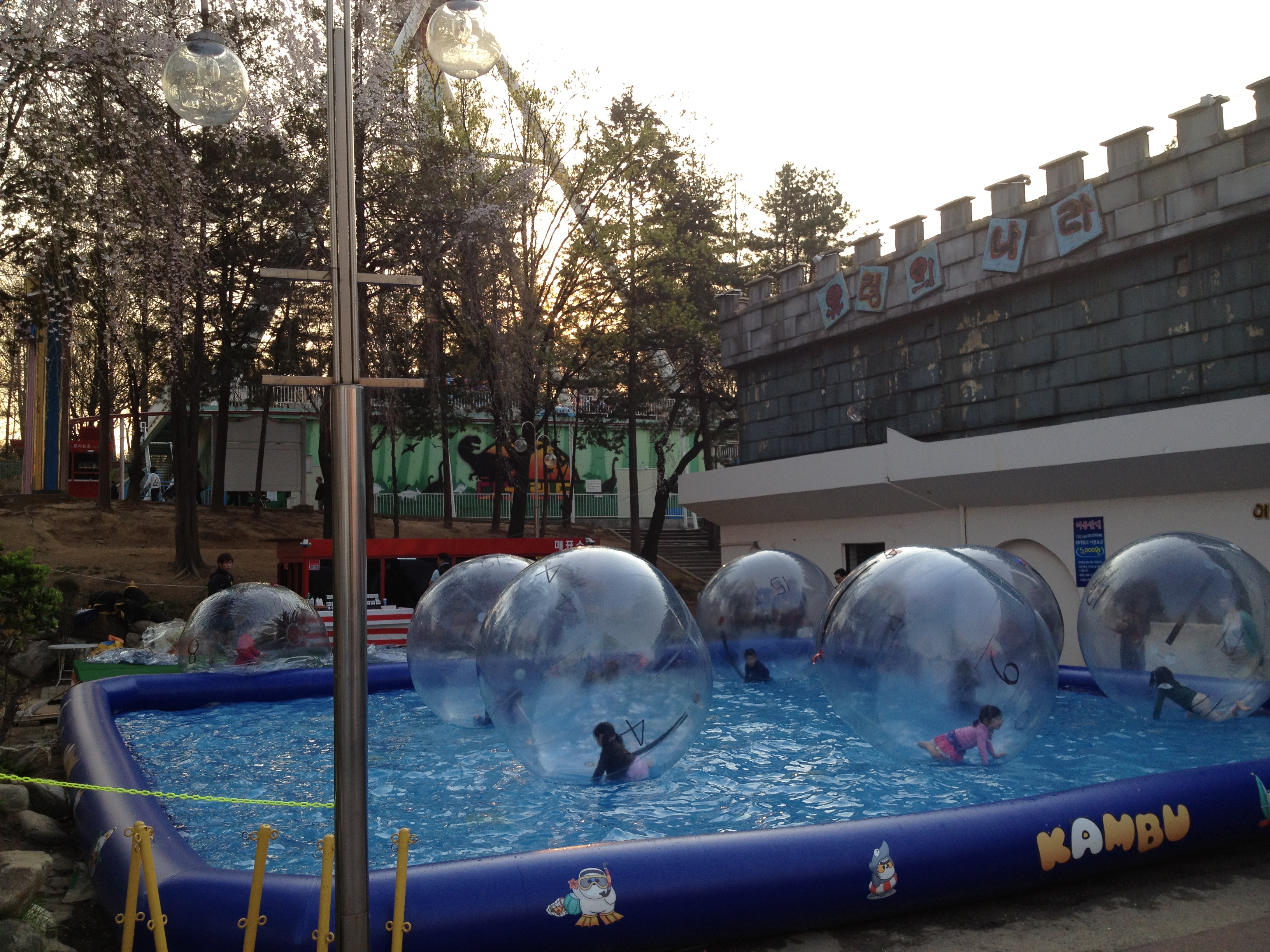 We watched as a small child crawled into a deflated bubble, the attendant inflated it and then rolled her into the pool.