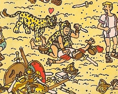 A Man About to Be Raped By a Mountain Lion in “Fun and Games in Ancient Rome, Find Waldo Now”