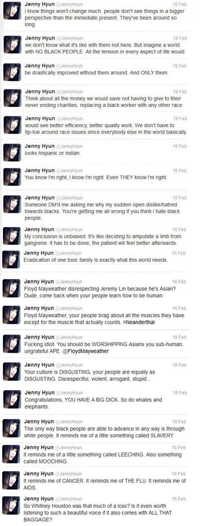 And finally this, proving February to be a really bad month of publicity for K-Pop, the story of Jenny Hyun, a songwriter for Girls’ Generation and Chocolat, who on February 16th got into a whole lot of hot water for her tirade on Twitter.