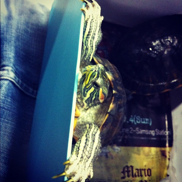 Zim, on the other hand, stayed close. She ate some plants near us and although she swam around a bit, she always returned to the spot where we put her into the water, popping her head out and staring directly at us. She was my favorite of the two turtles, the most interesting and the most engaging of the two, who continually tried to get our attention in the apartment and took a special liking to The Canadian One. She’d often stand up in her tank to peer over the edge and watch him playing the guitar or sitting at his computer.