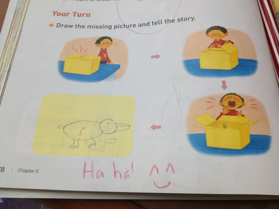 70% of the time, the kids say something funny while I’m actually AT my desk correcting homework, grading a paper, taking the attendance or whatever it is that I’m doing that they’re not doing so they have time to chat amongst themselves…or to me…and by ‘to me’…I mean just ‘at me’. The rest of the time, I’ve usually got a pen and a clipboard in my hand or the book with a post it note stuck on the page in case I need to jot something down. Nothing gets published unless I can remember it exactly and believe me, there are random notes knocking around my desk that look like they’d be hilarious quotes, I just can’t remember how they transpired.