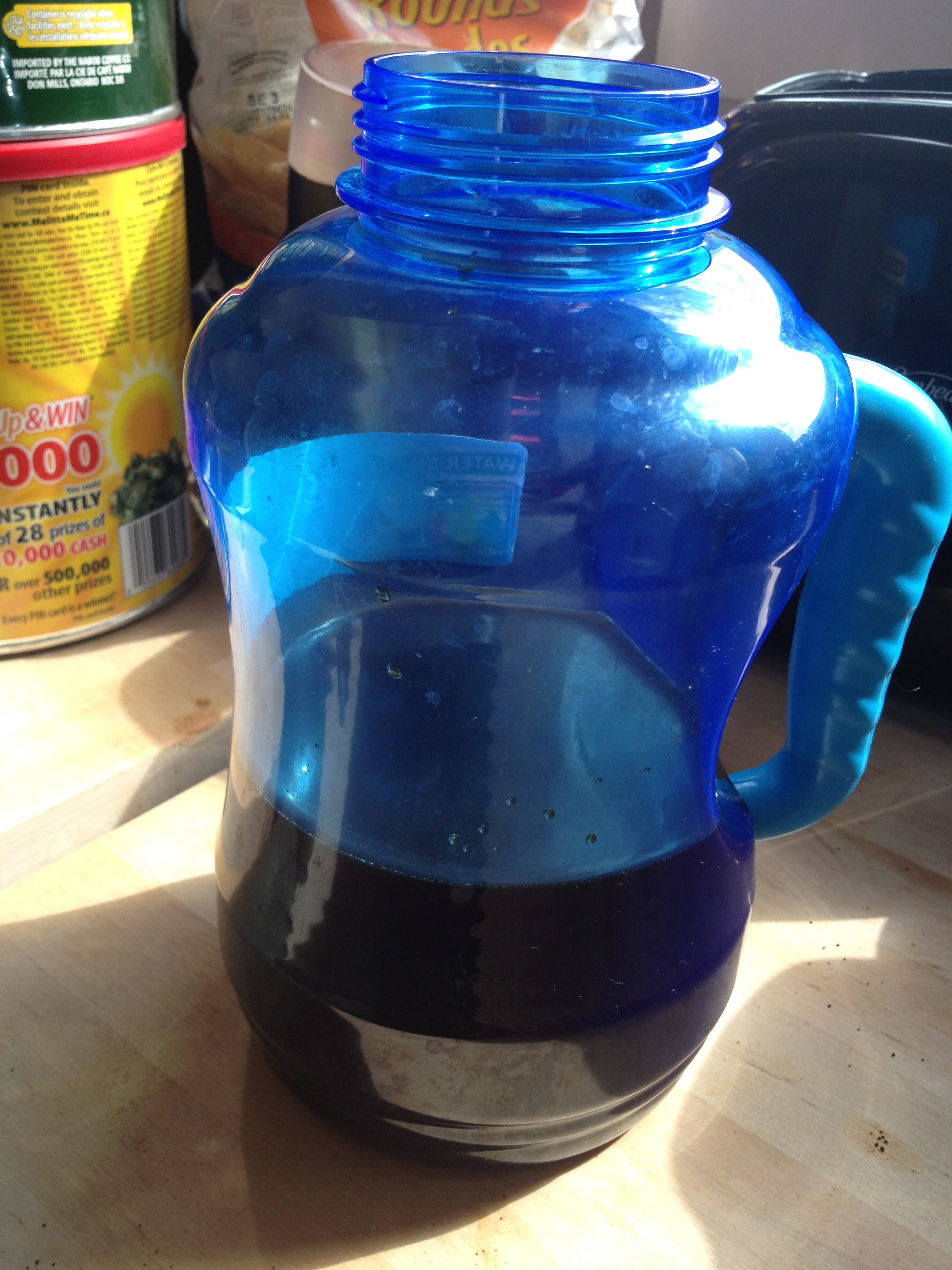 4. Now, at this point, you can just place all the filtered coffee in the fridge and when you want to drink it you can either do half coffee, half water or one third coffee, one third water and one third milk. What I usually do is add 2 cups of water to the filtered coffee and cut out the fiddling about with water in the mornings bit. That way, the coffee is ready to be poured and mixed with milk straight away. The first time you make this, you may want to play about with the amounts of water you add to find the right mix for you but generally I stick to the 2-6-2 method. (2 cups of coffee, 6 cups of water, waaaaait, then add 2 more cups of water)