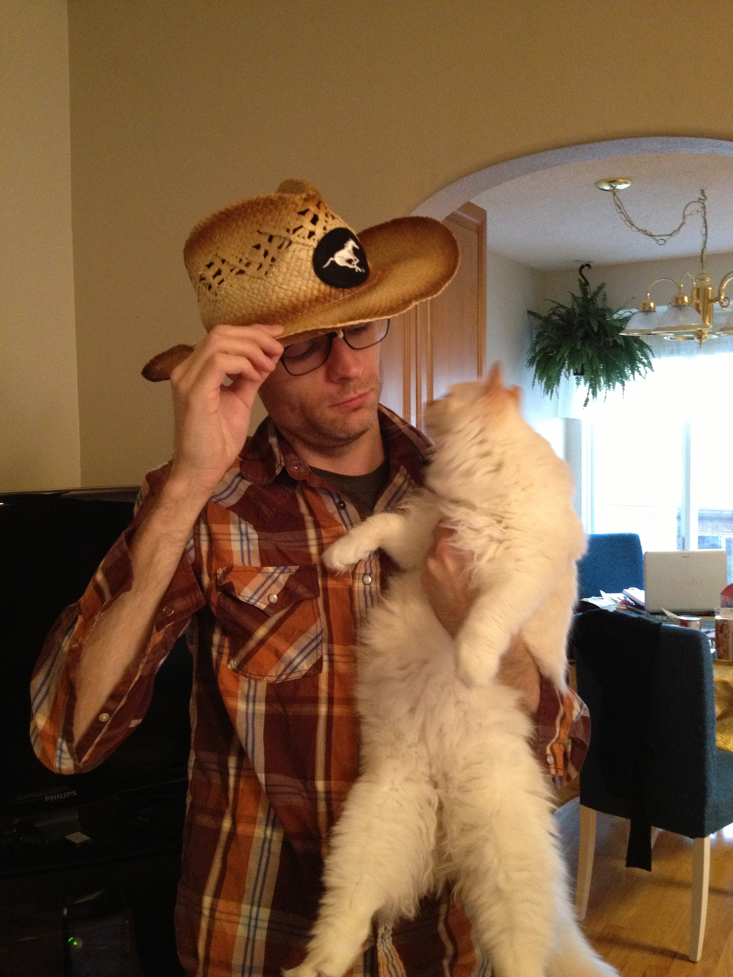 Isn’t he gorgeous?! Here he is with The Canadian One while we were cat-sitting while The Canadian One tries to prove to me his moniker should be changed to The Cat Whisperer.