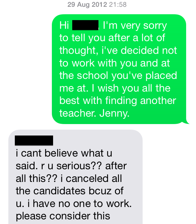 Despite this, I met with him and the school to sign the contract and then decided to rescind my acceptance of the job offer, mainly due the my distrust of the recruiter and the fact that he couldn’t tell me much about the job and had ‘forgotten’ my contract on the Wednesday contract signing meeting (before the Monday start date) and could only show me a ‘sample contract’.