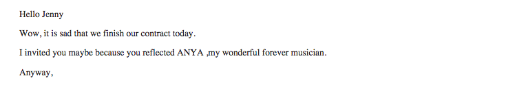 I later quit that job in the middle of the contract as I started to slowly come to the realisation that my director was just a teeny bit crazy, had no money and we were pretty sure he was going to just stop paying us at some point. Afterwards he sent me several emails, including a goodbye email: