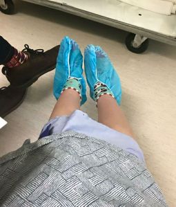 I got into my gown and booties and was sent back out into the waiting area to The Canadian One. I ran back out to him: “LOOK AT MY BOOTIES!!!! Gimme your phone!!!” They had taken my phone from me.