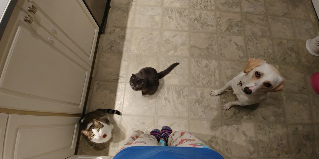 Actually, that’s a lie…when they make food, Purrkins, Pickles and I stand awkwardly close to mommy get a taster of some early dinner…It only sometimes works but that just means we need to try harder.